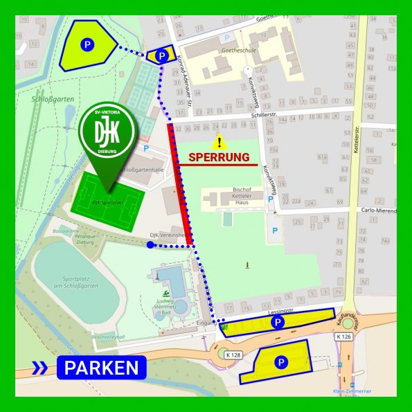 Im Umfeld des Vereinsheims werden nur Parkplätze für Betreuer, Spieler, Schiedsrichter und einige Funktionsträger zur Verfügung stehen. Ihnen werden Zufahrtstickets ausgestellt. Für andere Pkw wird die Zufahrt in den Schwimmbadweg von der Schillerstraße her gesperrt sein, was von der Ordnungspolizei der Stadt Dieburg überwacht wird.